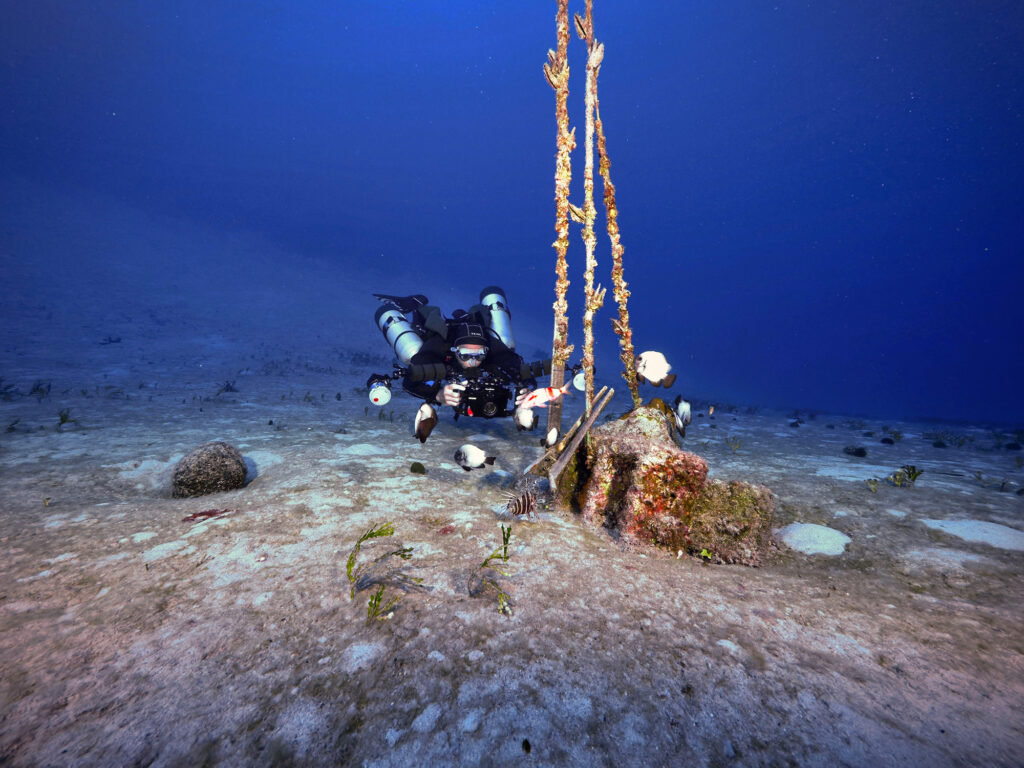 How to dive it: Swim across the sand flat to the cut at the edge of the wall. Head right and down the wall to 80 feet swim north about 150 feet looking for a big cut in the wall. Enter the cut under an overhang at 110 feet and swim through past the big black coral trees to the plateau at 90 feet. If you have time and air go out and around the big coral head and then follow the shallow wall south back to the boat.